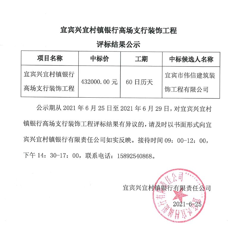 高場支行裝飾工程評標(biāo)結(jié)果公示